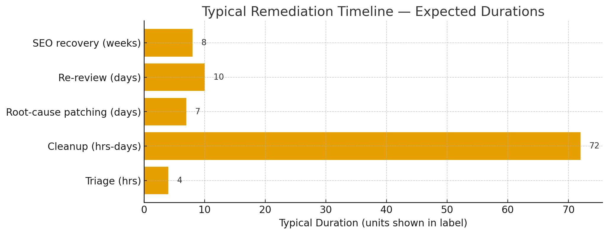 A representative remediation timeline image is available for download below. (Real timelines depend on site size and the complexity of compromise.)