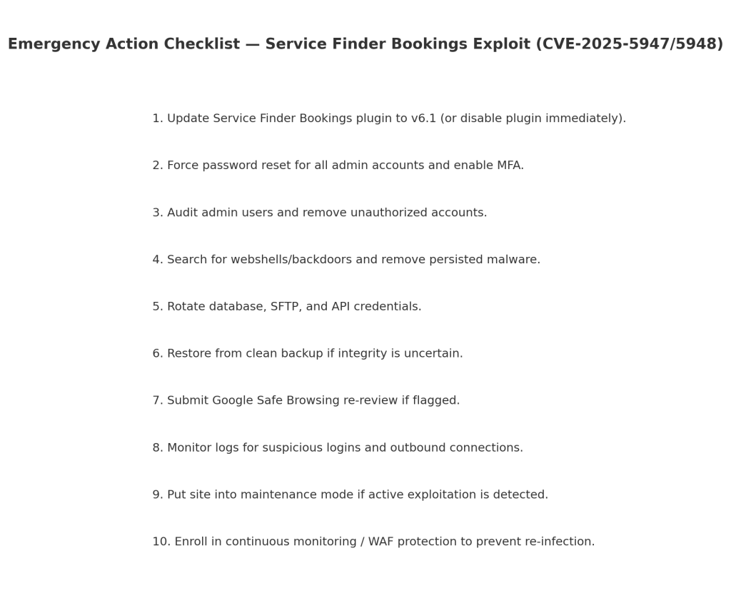 - Triage (0–4 hours): non-destructive scan, confirm presence/extent of compromise, and put site in maintenance mode if attack is active.