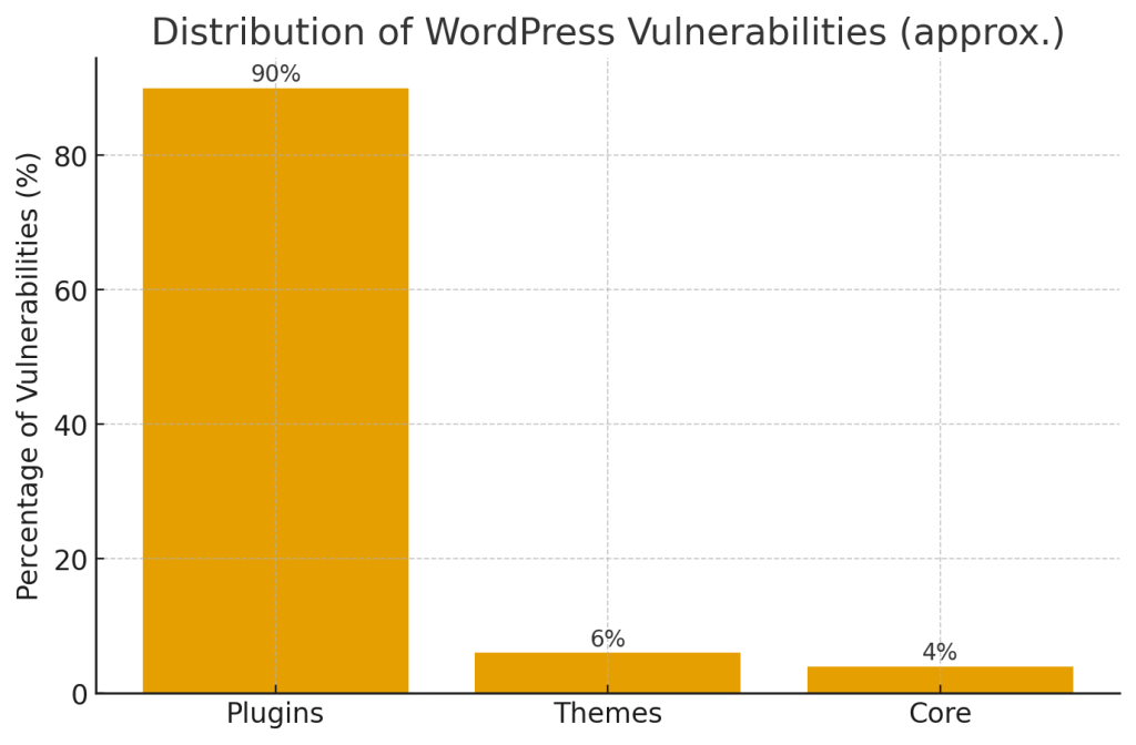 - The WordPress security ecosystem shows that the vast majority of reported vulnerabilities are in plugins — estimates used by researchers put plugin vulnerabilities at around ~90% of reported WordPress issues (with themes and core making up the remainder). That means plugin-related critical bugs like this one are statistically the most likely route to a site compromise.