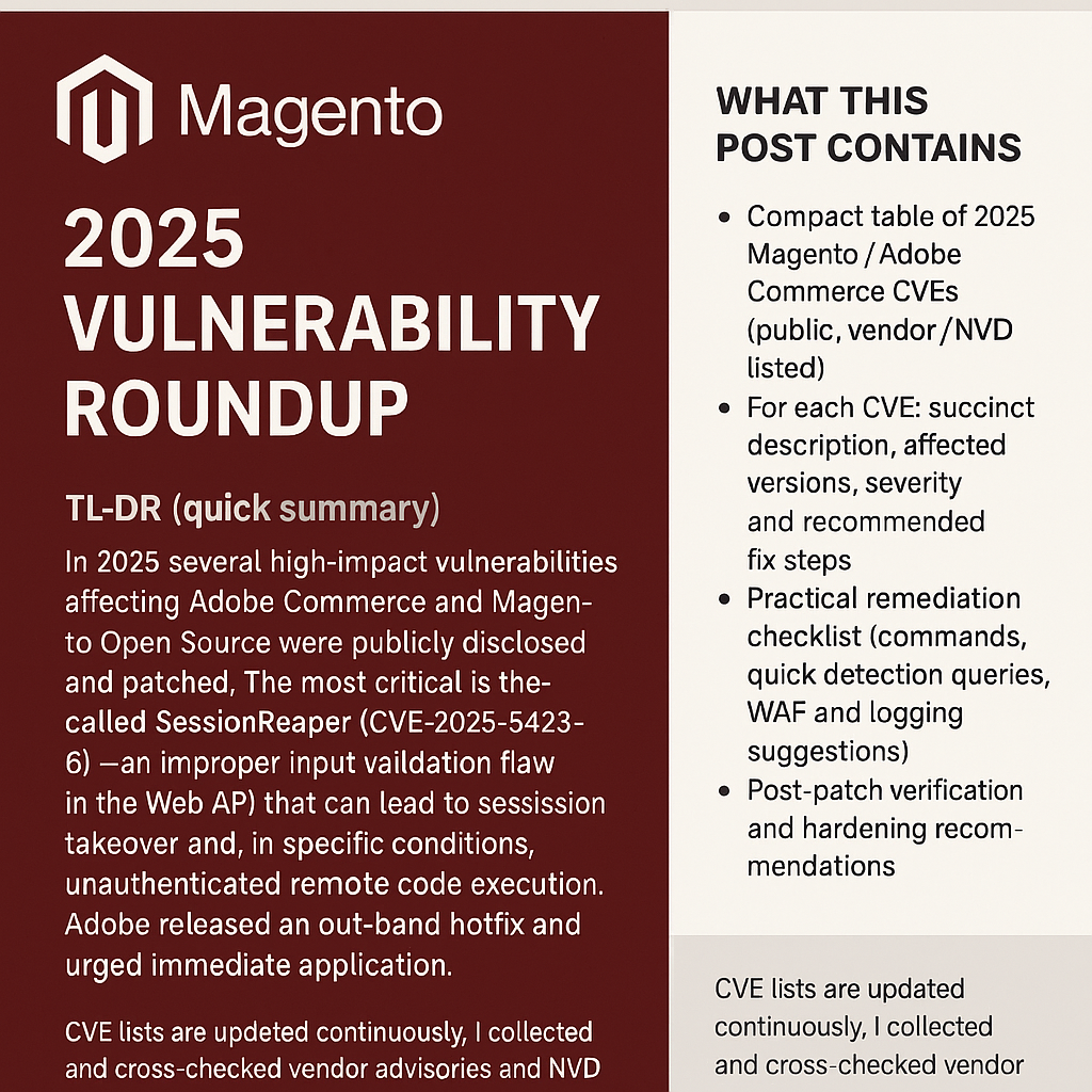In 2025 several high-impact vulnerabilities affecting Adobe Commerce and Magento Open Source were publicly disclosed and patched. The most critical is the so-called SessionReaper (CVE-2025-54236) — an improper input validation flaw in the Web API that can lead to session takeover and, in specific conditions, unauthenticated remote code execution. Adobe released an out-of-band hotfix and urged immediate application. Other important 2025 CVEs include a set of access-control and authorization bugs (several CVE entries), and multiple XSS/authorization issues fixed across release updates. Apply vendor patches immediately and follow the detection checklist below.