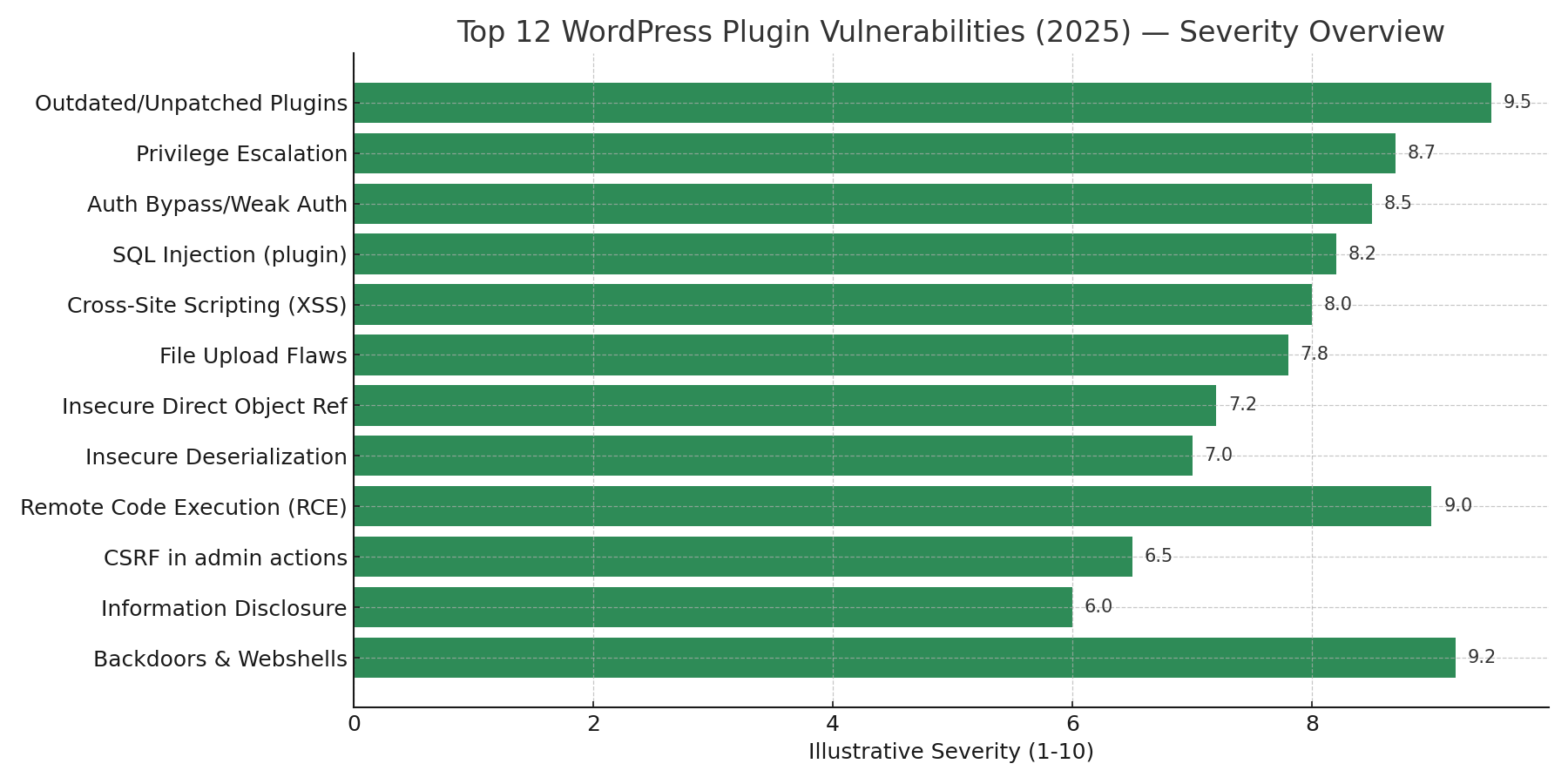 WordPress powers a huge share of the web, and plugins make it flexible — but plugins are also the most common source of site compromises. In 2025 attackers continue to target vulnerable plugins, using automation, supply-chain abuse, and legacy code mistakes to gain access. This guide inventories the Top 12 plugin vulnerabilities, explains how attackers exploit them, provides practical detection scripts and checks you can run today, and gives robust mitigation patterns: from vendor patches to virtual patching with a WAF.
